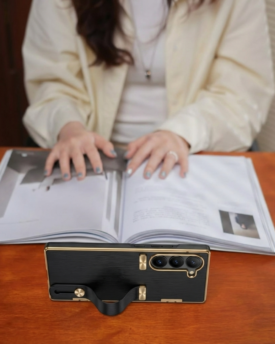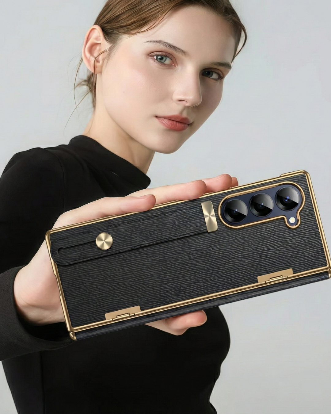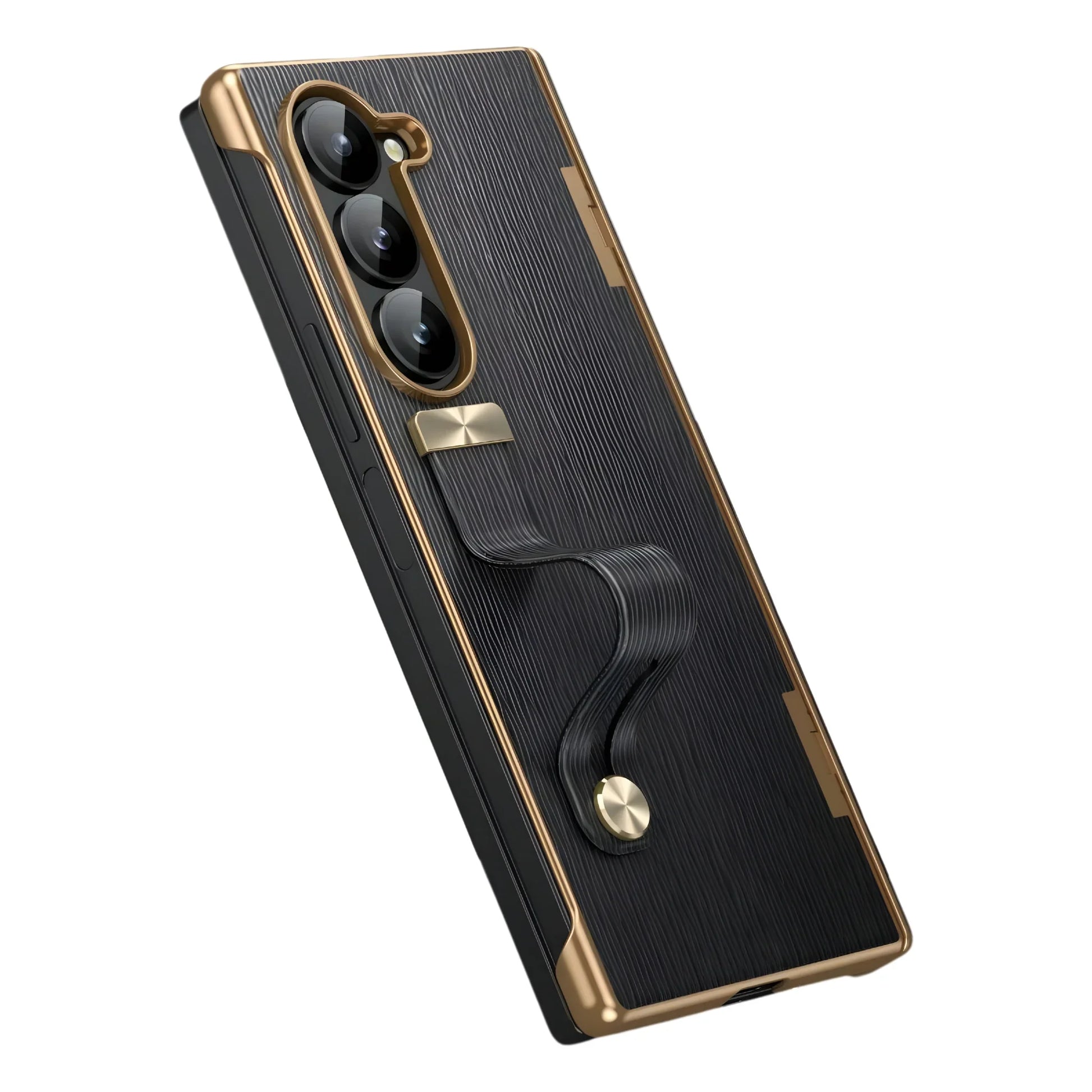 Wrap your Samsung Galaxy Z Fold in timeless elegance with this luxury PU leather case. Crafted from premium materials, it offers a sophisticated look and feel, enhanced by a convenient wrist strap for added security